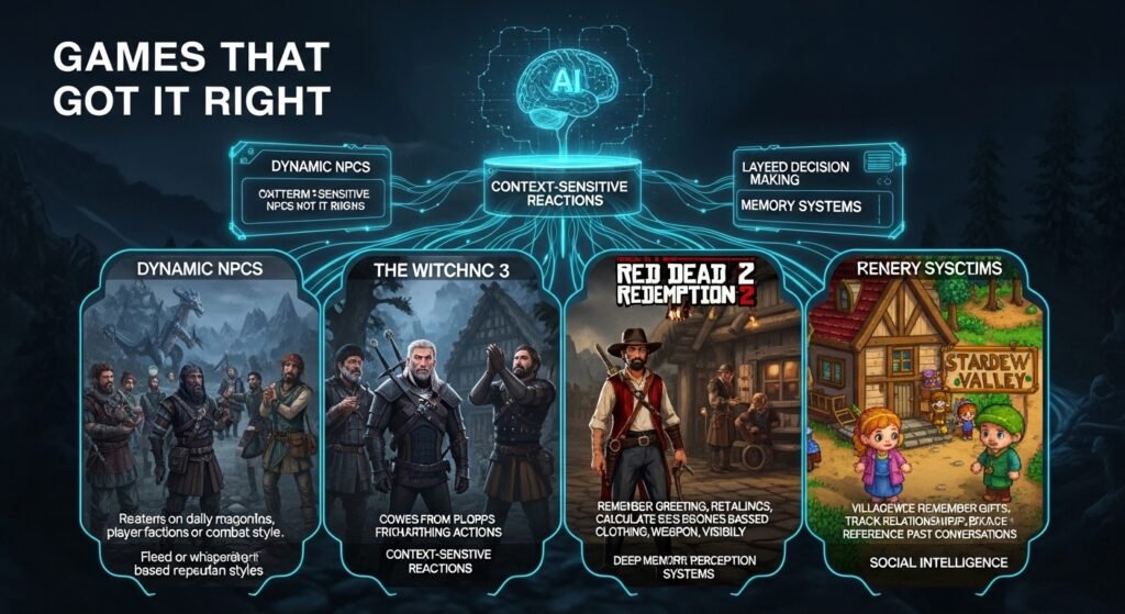 The Elder Scrolls V: Skyrim introduced many players to dynamic NPC reactions, though imperfectly. Its radiant AI system gave characters daily routines, basic perception, and memory. Guards would comment on your faction membership, thieves guild affiliation, or combat style. Citizens fled from dragons and whispered about your notorious deeds.